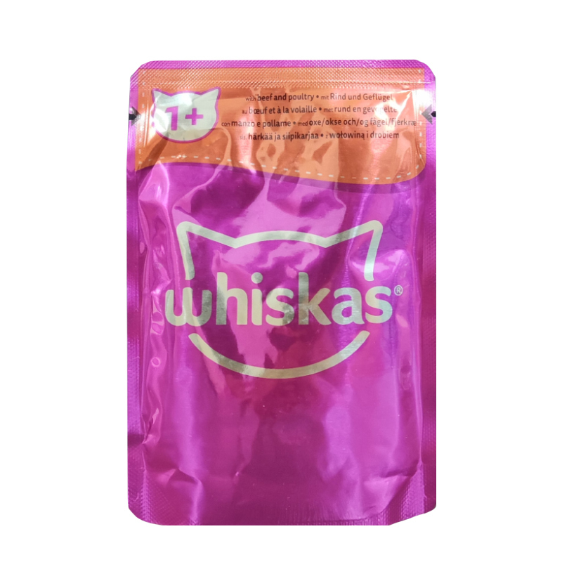 پوچ گربه ویسکاس با طعم گوشت گاو و پرندگان Whiskas Cat Pouch With Beef & Poultry In Jelly وزن 85 گرم