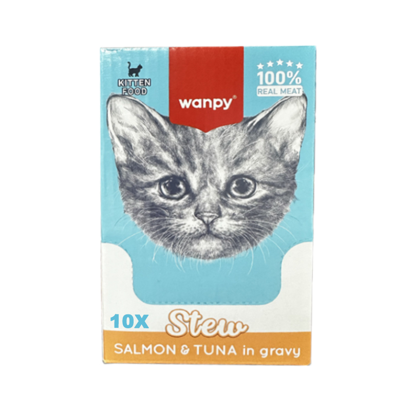 پوچ خورشتی بچه گربه ونپی مدل استیو با طعم تن و سالمون Wanpy Stew With Tuna & Salmon in Gravy بسته 10 عددی