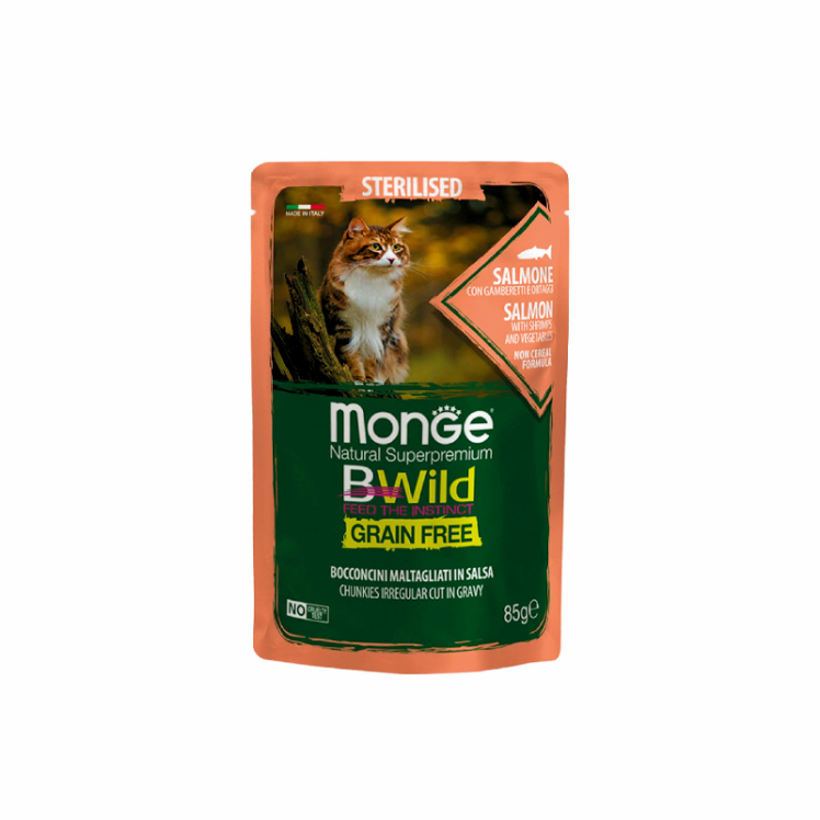 پوچ گربه عقیم مونژ مدل بیوایلد طعم ماهی سالمون و میگو Monge Bwild Sterilised Cat Pouch Salmon وزن 85 گرم اتمام موجودی تاریخ انقضاء: 05/2029