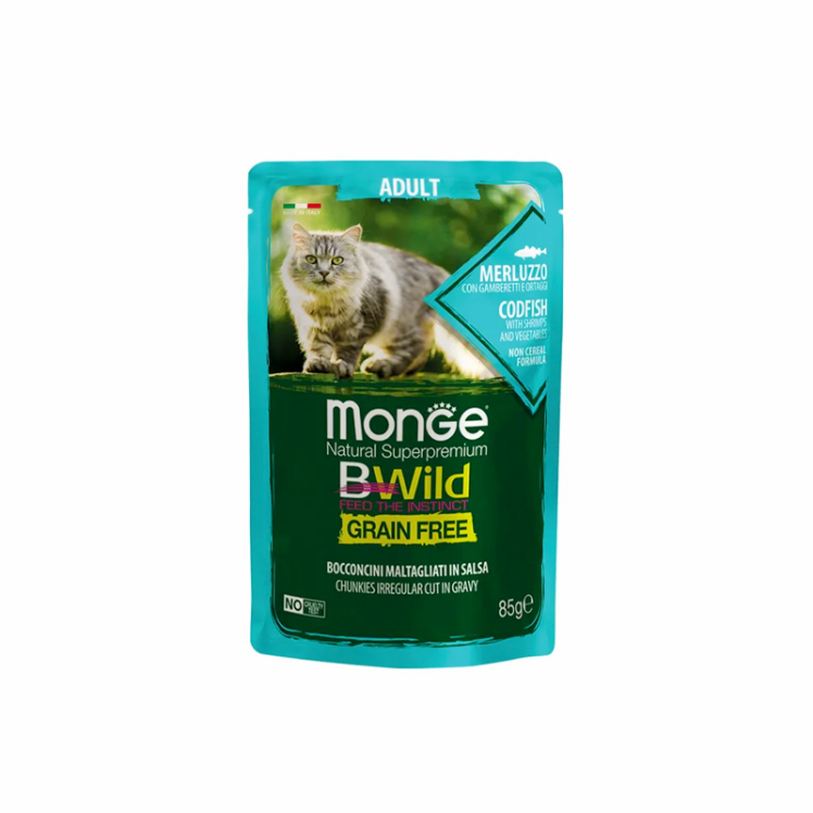 پوچ گربه مونژ مدل بیوایلد با طعم ماهی کاد و میگو Monge Bwild Cat Pouch with Codfish وزن 85 گرم اتمام موجودی تاریخ انقضاء: 07/2029