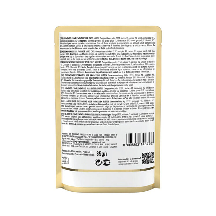 غذاهای کنسرو شده گربه و سگ Schesir در کشور ایتالیا و شهر ژنو فقط با بهترین مواد طبیعی تهیه می شوند. Schesir علامت تجاری برای تولیدات کمپانی Agras Pet Foods است ، شرکت غذای حیوانات خانگی آگراس در ژوئن 1986 با هدف تولید غذای حیوانات اهلی با استاندارد های مصرف انسانی آغاز به کار کرد. Agras Pet Foods محصولات خود را در تقریبا 70 کشور در سراسر جهان به فروش می رساند. هر غذای کنسروی گربه و سگ Schesir فاقد مواد نگهدارنده ، رنگ دهنده و مواد افزودنی است. این غذاهای کنسروی دارای موادی هستند که حتی برای مصرف انسان نیز مناسب هستند.