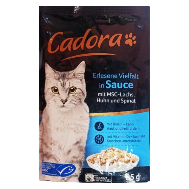 پوچ گربه کادورا با طعم مرغ ، ماهی و اسفناج در سس Cadora Cat Pouch وزن 85 گرم اتمام موجودی تاریخ انقضاء : 01/2026