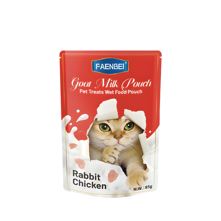 پوچ گربه فنبی با قطعات خرگوش و مرغ در شیر بز Faenbei Cat Goat Milk with Rabbit & Chicken Pouch وزن 85 گرم به زودی
