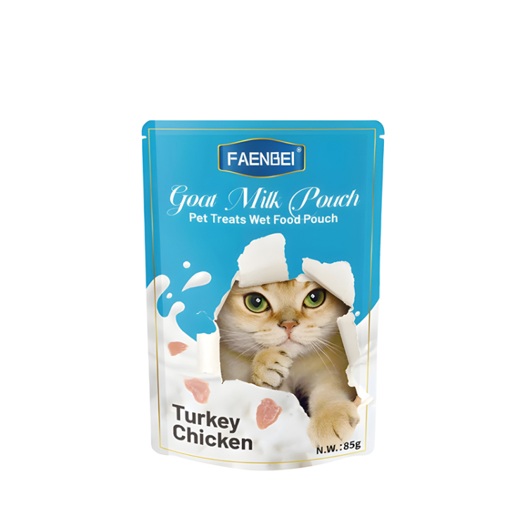 پوچ گربه فنبی با قطعات مرغ و بوقلمون در شیر بز Faenbei Cat Goat Milk with Chicken Turkey Pouch وزن 85 گرم به زودی