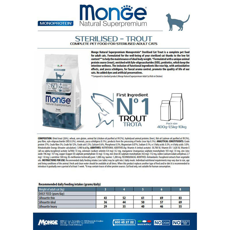 غذای خشک گربه عقیم شده مونژ با طعم ماهی قزل آلا Monge Natural Superpremium Sterilised Cat Food وزن 400 گرم