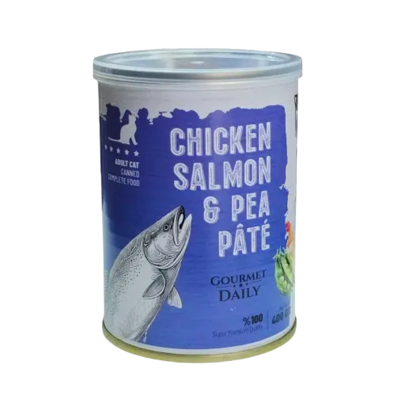 کنسرو گربه دی پی اس پته با طعم گوشت مرغ و سالمون و نخود فرنگی وزن 400 گرم