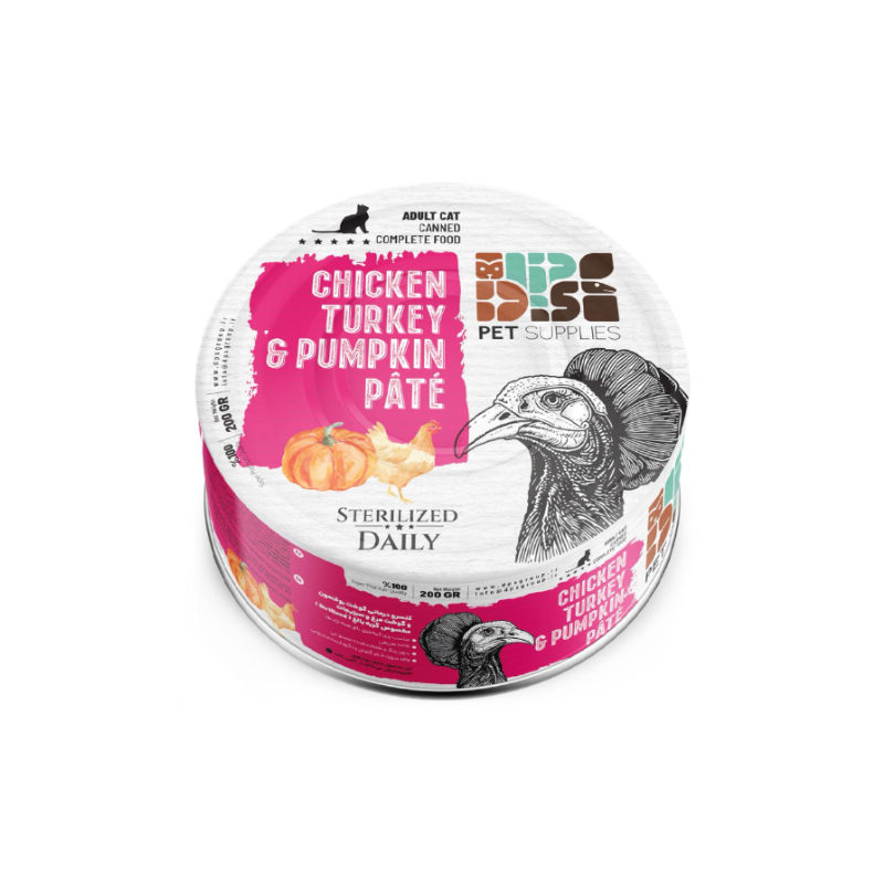 کنسرو گربه دی پی اس پته با طعم گوشت مرغ و بوقلمون و کدو وزن 200 گرم