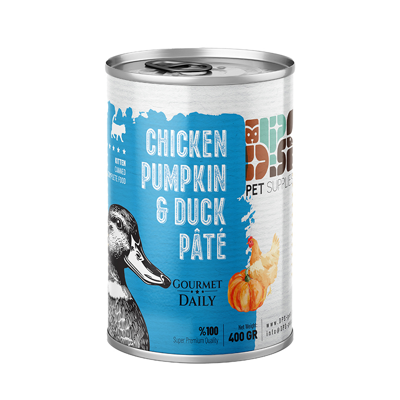 کنسرو بچه گربه دی پی اس پته با طعم گوشت مرغ و کدو حلوایی و اردک وزن 430 گرم