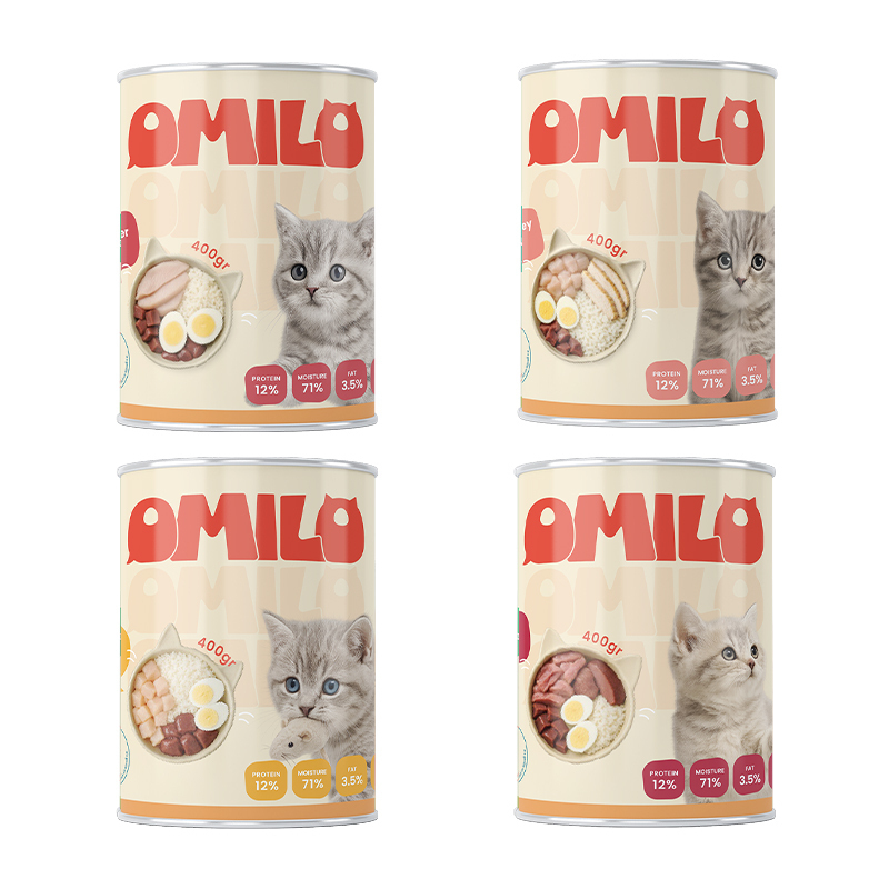 - مجموعه شامل 4 عدد کنسرو اومیلو پته ۴۰۰ گرمی با طعمهای:- گوشت مرغ و جگر