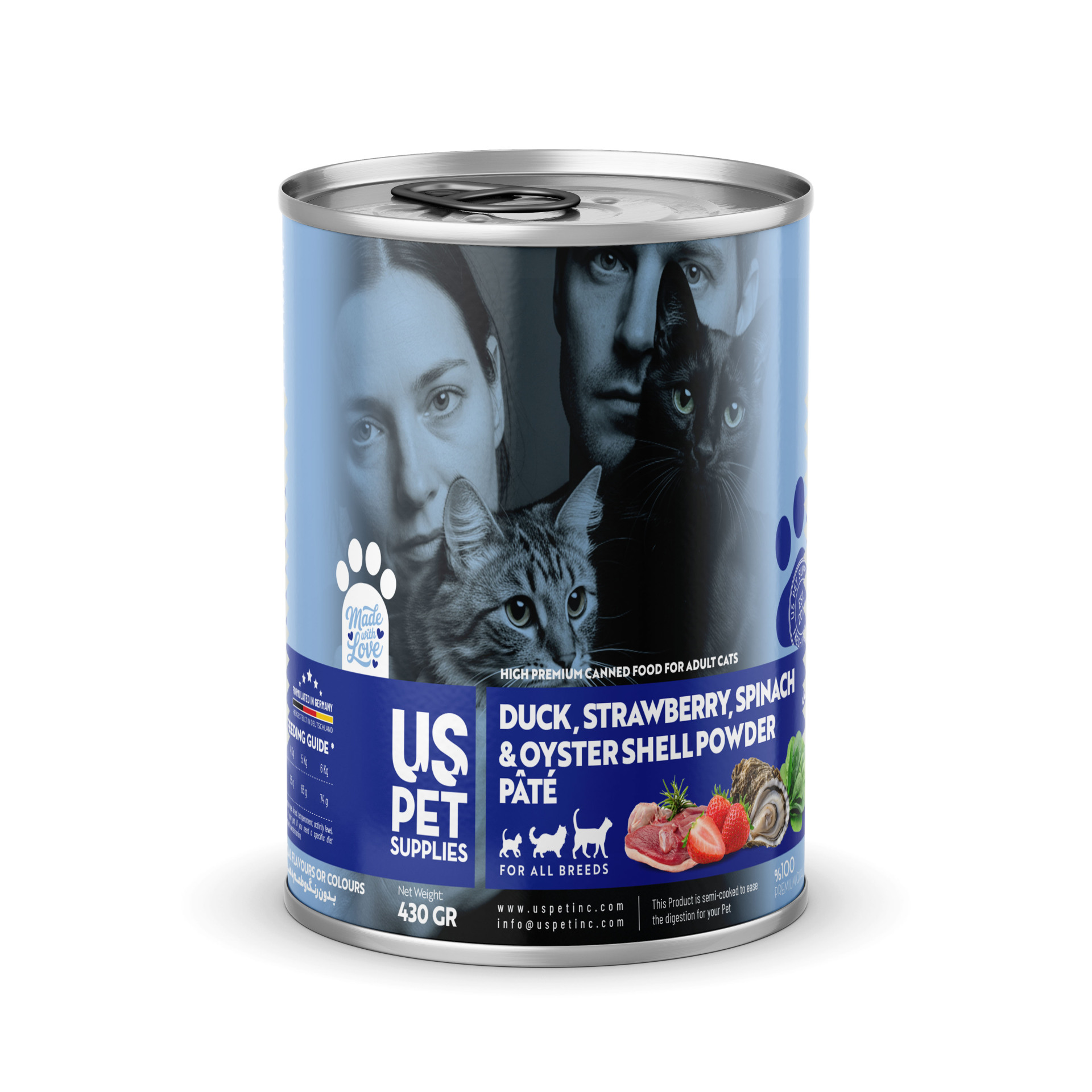 کنسرو غذای گربه یو اس پت مدل های پریمیوم با طعم اردک اسفناج توتفرنگی و پودر صدف وزن 430 گرم