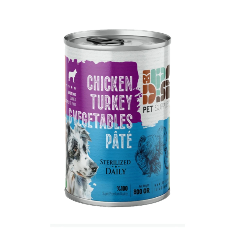 کنسرو سگ دی پی اس پته با طعم گوشت مرغ و شترمرع و سبزیجات وزن 400 گرم