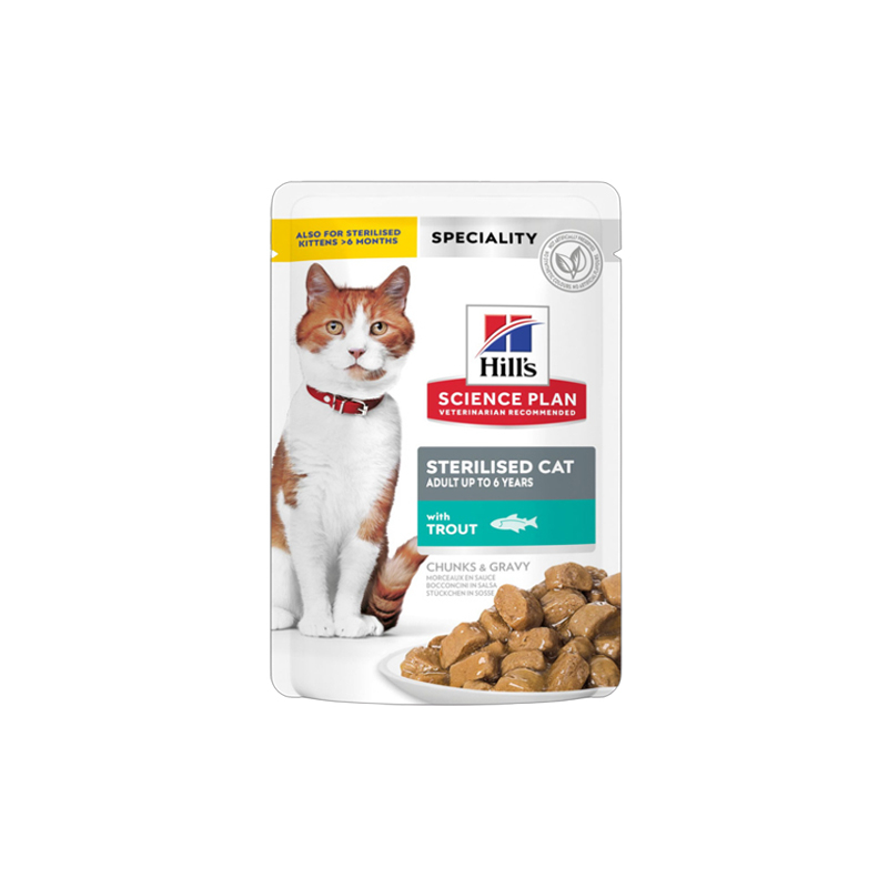 پوچ گربه عقیم هیلز مدل چانک در سس با طعم قزلآلا HILL’S Pouch for Sterilized Adult with Trout وزن ۸۵ گرم
