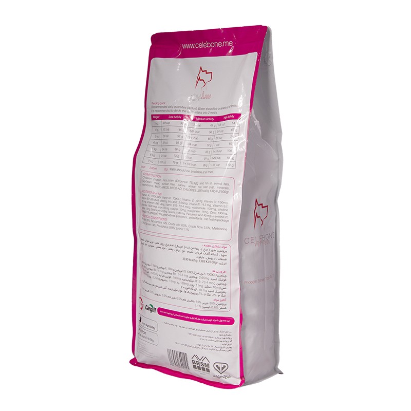 وزن این محصول 2500 گرم است و مخصوص گربههای داخل خانه با وزن بین 3 تا 9 کیلو مناسب است. گفتنی است که با مکملهایی مثل برنج، تخم مرغ از افزایش وزن گربه جلوگیری میکند. افزودنیهای این محصول شامل ویتامینهای B1، B12، C، D، پروبیوتیک، امگا 3-6 و الکارنتین است که برای تقویت ماهیچه و قلب گربه بسیار مفید است. این رژیم غذایی خوشمزه و کامل فقط حاوی 10% چربی بوده، اما حاوی مقدار زیادی از پروتئینهای مغذی از مرغ و منبع بالایی از ویتامینهای گروه b است که همراه منبع بالای فیبر محلول برای تنظیم سیستم گوارش برای هضم آسان و بهبود سلامت مو و استخوانها بسیار مناسب است. همچنین از مزهی خوبی برخوردار است و یک غذای کامل برای گربههای شما را فراهم میکند. پروتئین و طعم اصلی غذای خشک گربه سلبن مرغ است.