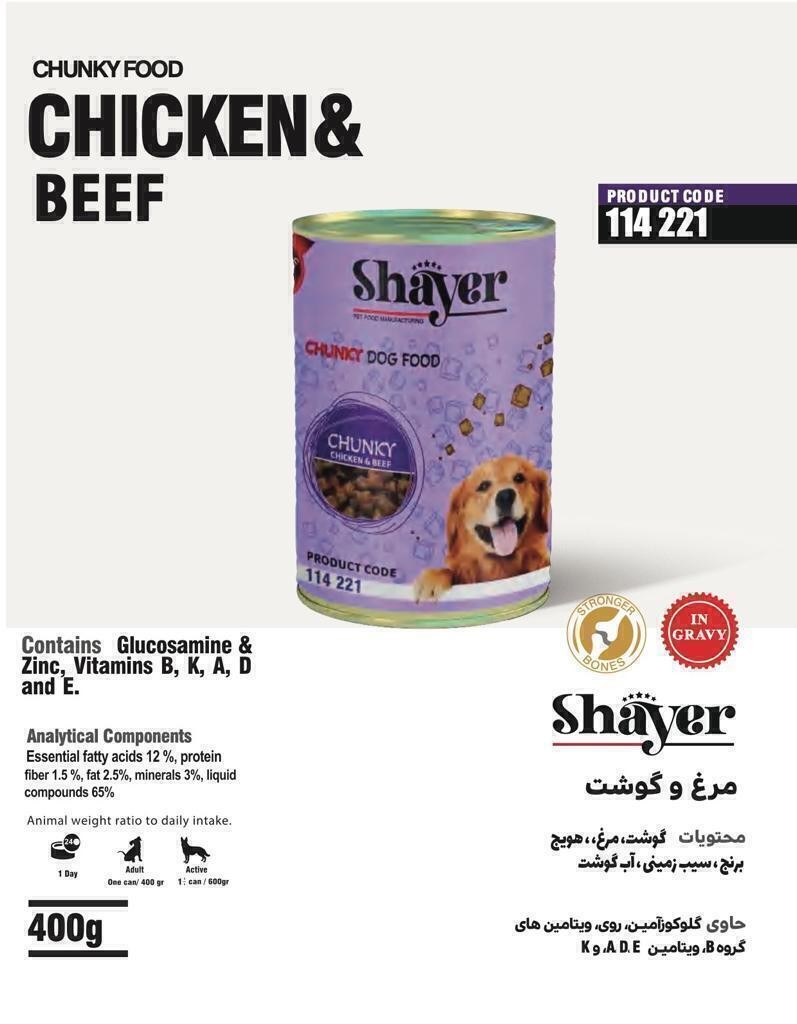 کنسرو غذای سگ با طعم مرغ و گوشت شایر Shayer Chunky Chicken & Beef وزن 400 گرم